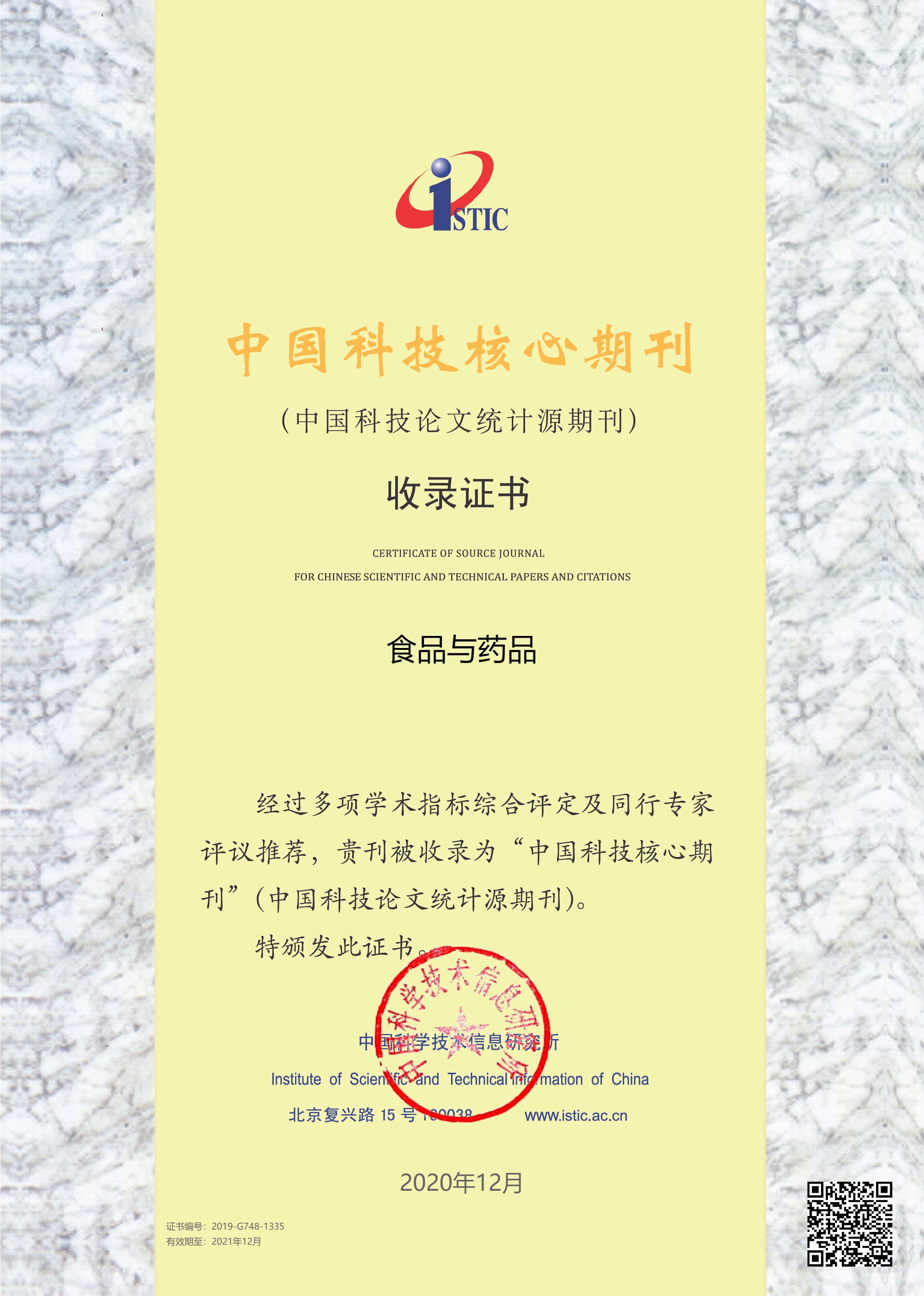 2020年12月29日,中国科学技术信息研究所以线上会议形式召开“中国科技论文统计结果发布会”。会上发布2020年中国科技核心期刊(中国科技论文统计源期刊,CSTPCD)目录,《食品与药品》实现连续多年入选此目录。